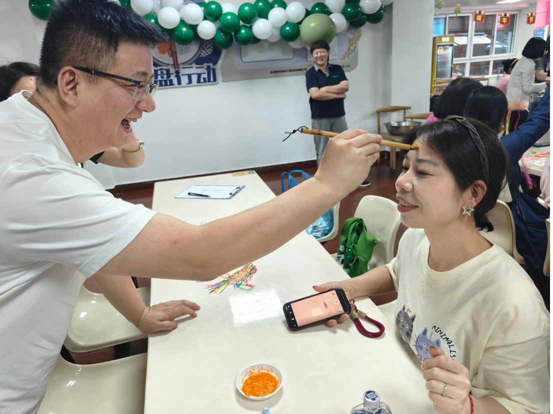 除了包粽子外,還組織了縫香包、編蛋袋、撞蛋、點額等形式多樣的活動。其中點額儀式則是端午節(jié)活動中的一項重要儀式?,F(xiàn)場擺放著雄黃酒和艾草制品,大家將雄黃酒點在額頭、耳后、手腕等處,雄黃酒香氣四溢、艾草清香撲鼻,構(gòu)成了端午獨特的氣息,這不僅是對傳統(tǒng)文化的尊重與傳承,更是讓我們在現(xiàn)代生活中仍感受到那份來自古代的智慧與關(guān)懷。